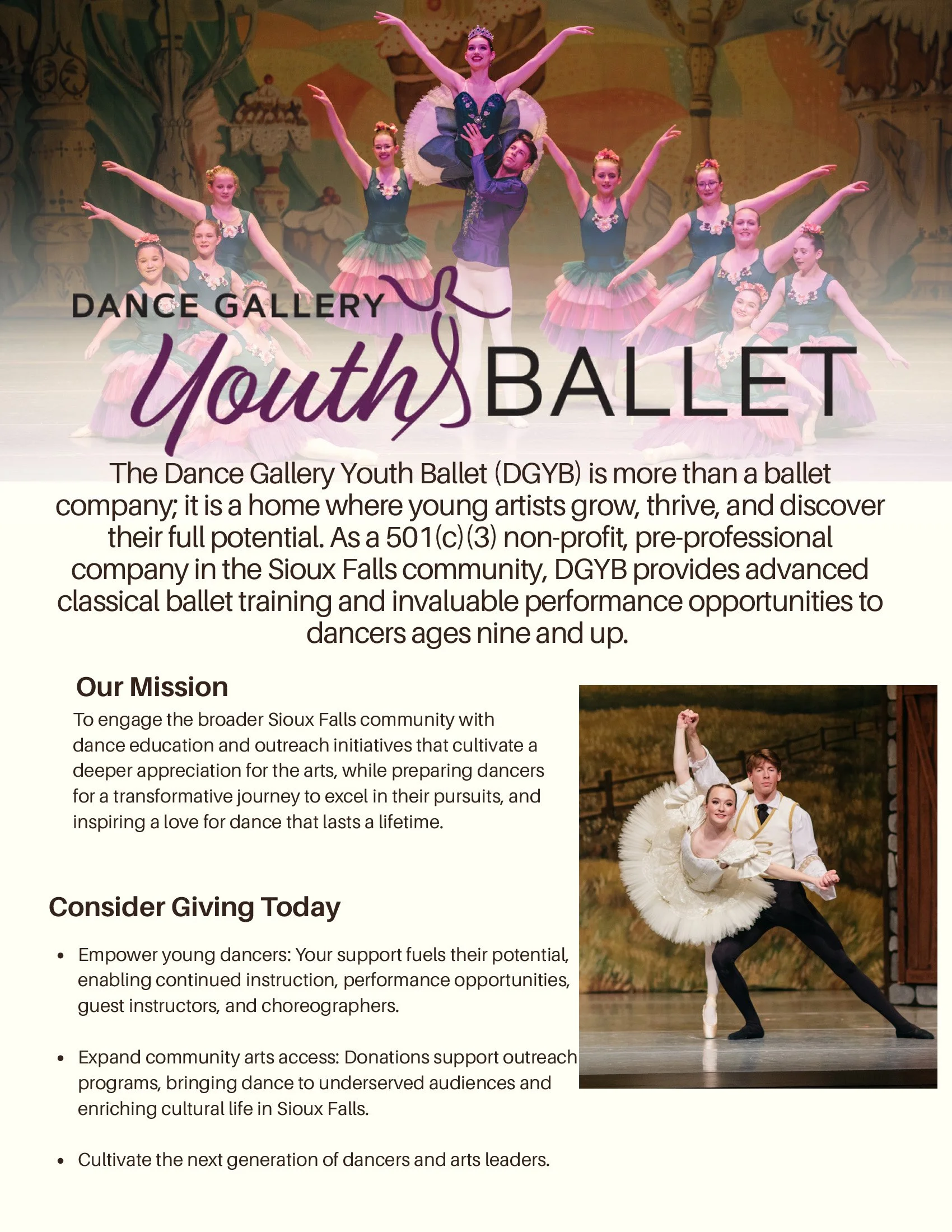 Dance Gallery Youth Ballet (DGYB) is a 501(c)(3) non-profit, pre-professional ballet company in Sioux Falls, South Dakota, dedicated to fostering advanced classical ballet training and enriching performance opportunities for dancers aged 9 and up. Our mission is to nurture a deep passion for the art of dance while creating a positive and inclusive environment that brings families from all walks of life together.