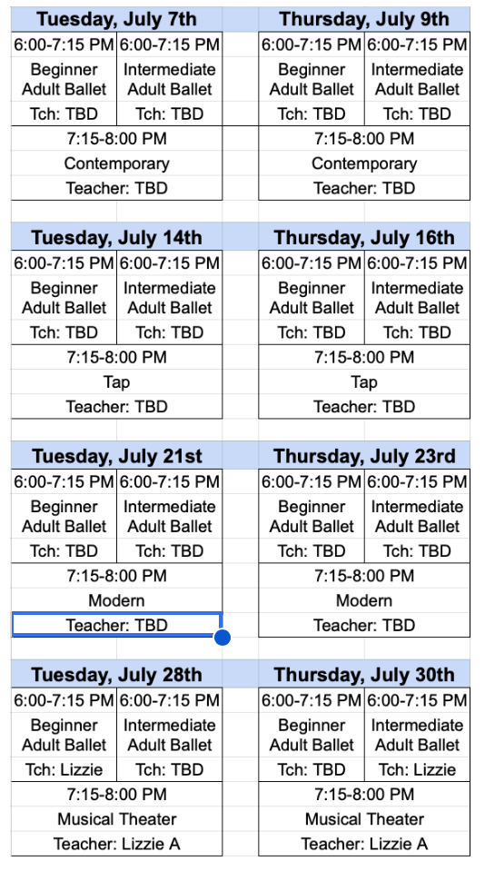 This intensive is designed for adults who want to explore ballet and other dance styles, including tap, jazz, musical theater, and contemporary. Ballet is offered at both beginner and intermediate levels, while all other classes are multi-level. The intensive runs from July 7th-30th on Tuesdays and Thursdays from 6:00-8:00 PM.